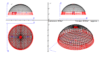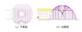 圖3給出的是穹頂建筑展廳平面和剖面的聲線分析圖。從圖3中可以直觀的看到該建筑存在明顯的聲聚焦現(xiàn)象。