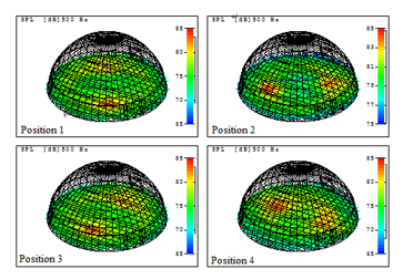 考慮展廳在進行展覽時,存在的聲源點較多,因而形成的聚焦點區(qū)域也比較廣。圖4給出的是聲源頻率為500 Hz,采用四個不同聲源點位置仿真,所產(chǎn)生的對應聚焦點模擬結(jié)果。