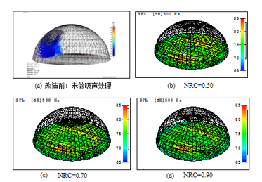 從圖5中我們可以看出,材料降噪系數(shù)NRC為0.50時存在較明顯的聲聚焦現(xiàn)象。當材料降噪系數(shù)NRC增加到0.70時,聲聚焦程度稍微減弱,但依然存在。而采用降噪系數(shù)NRC為0.90時,聲聚焦現(xiàn)象得到有效改善。