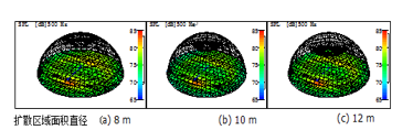 圖6給出的頂部擴散區(qū)域面積直徑分別為8 m、10 m和12 m,頻率為500 Hz時的典型聲壓級圖。