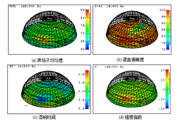 3) 混響時間 根據(jù)穹頂建筑作為展廳使用的功能要求,混響時間確定為RT=1.2 s。保證空間內(nèi)活動的人員能夠聽清楚發(fā)出的全部信息。各頻帶(125 - 4000 Hz)模擬結(jié)果顯示混響時間(RT)滿足最佳值范圍,滿足混響時間設(shè)計指標。圖7(c) 是500 Hz的典型混響時間(RT)圖。