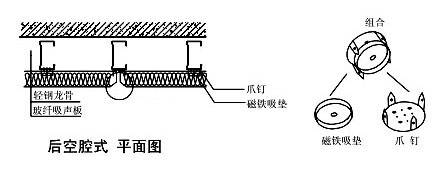 采用輕鋼龍骨慢刷、玻纖吸聲板上對應(yīng)輕鋼龍骨部位慢刷粘結(jié)劑方式固定連接。必要時可選擇采用配套配件(爪釘和磁鐵吸墊),以增加粘結(jié)的牢固性。